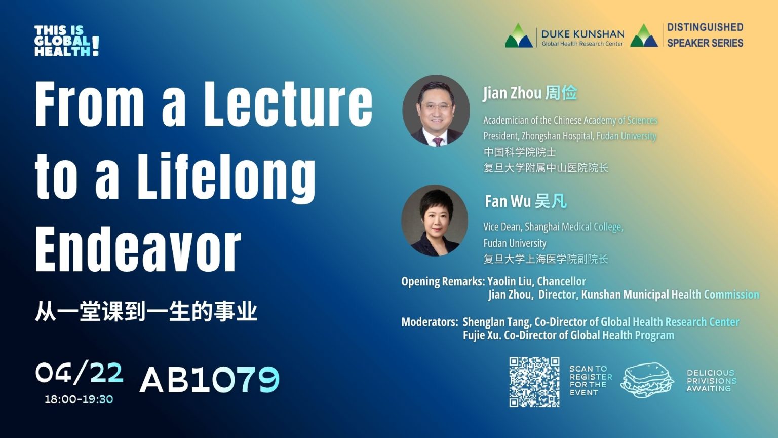On April 22, the Duke Kunshan University “This is Global Health!” Symposium Series will collaborate with the Distinguished Speaker Series to host a special event, featuring Prof. Jian Zhou, Academician of the Chinese Academy of Sciences and President of Zhongshan Hospital, Fudan University. In his keynote address, he will reflect on his 40-year journey in education and career—from being inspired as an undergraduate by Academician Zhaoyou Tang to becoming a leading surgeon, scholar, and hospital administrator. A panel discussion will follow, featuring Prof. Fan Wu, Vice Dean of Shanghai Medical College, Fudan University. Together, they will explore the challenges and reflections involved in improving global health and illuminating millions of lives. This is a dialogue about personal growth, legacy, and mission—dedicated to everyone seeking a moment of “being inspired.”