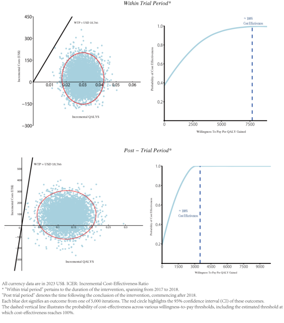 The study found that the SINEMA intervention was cost-effective both in the short term and over the long run. The figure clearly illustrates that the SINEMA intervention demonstrated stable and remarkably high cost-effectiveness in both the short term (trial period) and the long term (follow-up period). Results from probabilistic sensitivity analyses and acceptability analyses under varying willingness-to-pay thresholds consistently supported the conclusion that the intervention is cost-effective.