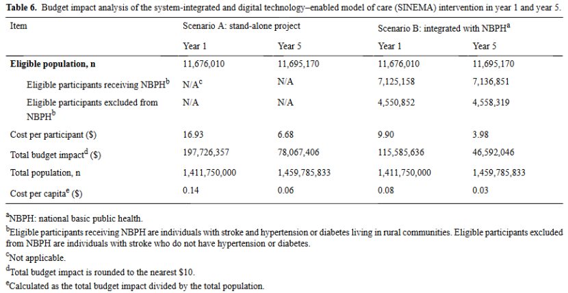 The research team also conducted a budget impact analysis to assess the financial feasibility of scaling up the SINEMA model nationwide. The research team assumed that the SINEMA intervention could reach China’s rural stroke population within five years. The table presents the projected implementation costs for Year 1 and Year 5, comparing two rollout scenarios: Scenario A — independent program implementation, and Scenario B — integration into the National Basic Public Health Service.