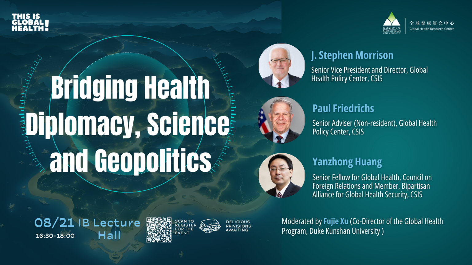 昆山杜克大学全球健康研究中心于2014年创办全球健康系列讲坛,旨在邀请全球健康领域领军人物、科学家及行业杰出者,就全球健康领域的最新研究进展、国际国内发展趋势、全球健康教学与实践经验开展讲座交流,帮助师生和各界合作者拓宽全球视野,促进知识分享,鼓励创新思路,加强学科合作。自2020年起,在兴证全球基金管理公司和宁泉资产管理公司的慷慨支持下,该系列被冠名为 “兴泉全球健康系列讲坛” 。截至2025年7月,共成功举办了200场讲座活动。