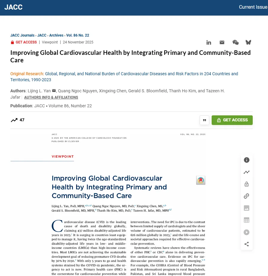 国际顶尖心血管期刊《美国心脏病学会杂志》(JACC)(IF=22.4)日前推出全球疾病负担(Global Burden of Disease, GBD)专题特刊,其中刊登了昆山杜克大学全球健康研究中心阎丽静教授牵头撰写的《通过整合基层与社区医疗改善全球心血管健康》(Improving Global Cardiovascular Health by Integrating Primary and Community-Based Care)观点评述文章。